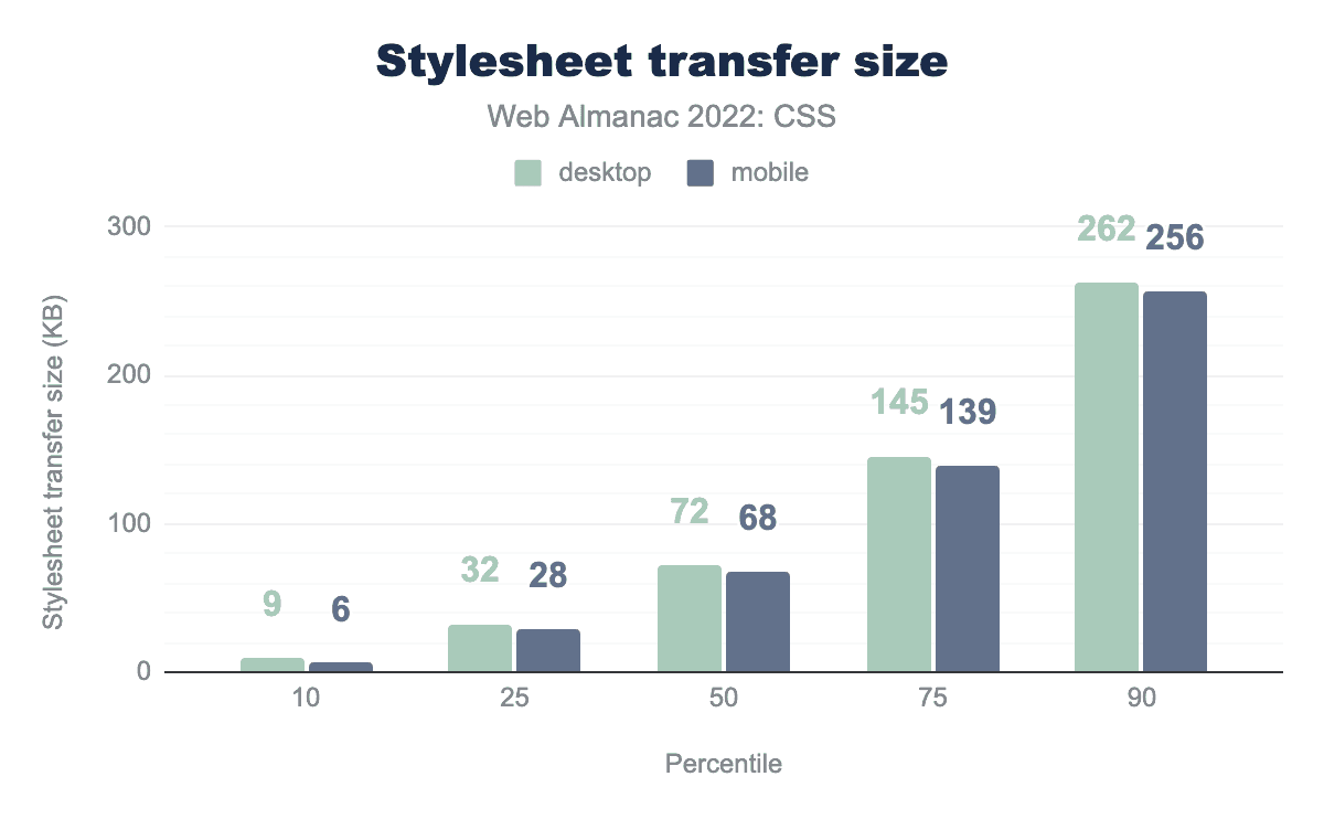 25パーセンタイルが1ポイント下がった他は、各パーセンタイルでわずかながら増加した。90パーセンタイルでは、7%近く増加し、2020 と 2021 の間で見られた増加と同様の増加でした。モバイル用のスタイルシートは、デスクトップ用に提供されるスタイルシートよりもわずかに小さいままです。