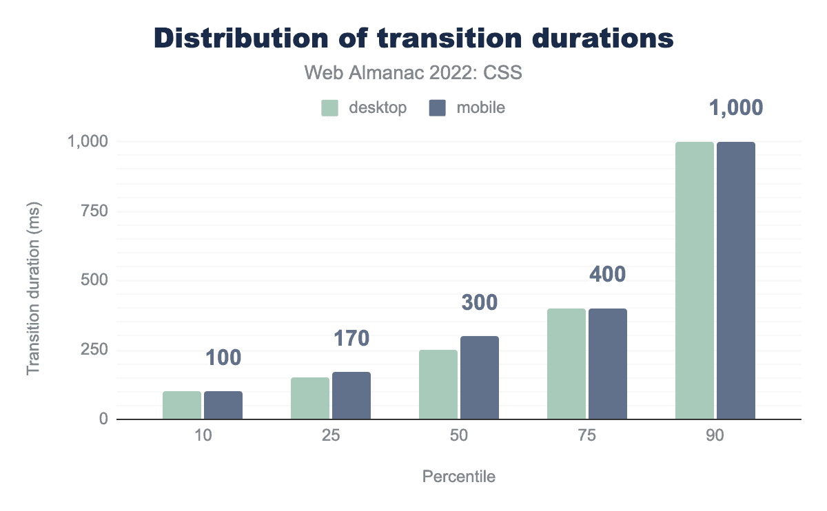 遷移の持続時間を見ると、昨年からの変化が見られます。 2021年、90パーセンタイルでは、遷移時間の中央値は0.5秒でしたが、現在では1秒に跳ね上がっています。上位4つのパーセンタイルすべてで増加していることがわかります。