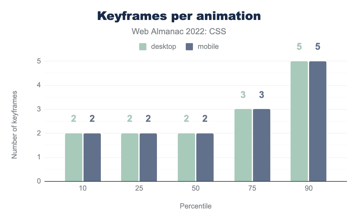 また、1つのアニメーションに使用されるキーフレームの平均数を調べたところ、6,995個という驚異的な数のキーフレームを使用しているサイトが見つかりました。しかし、これは異常なことで90パーセンタイルでも、1アニメーションあたりのキーフレーム数は、デスクトップとモバイルの両方で5個です。