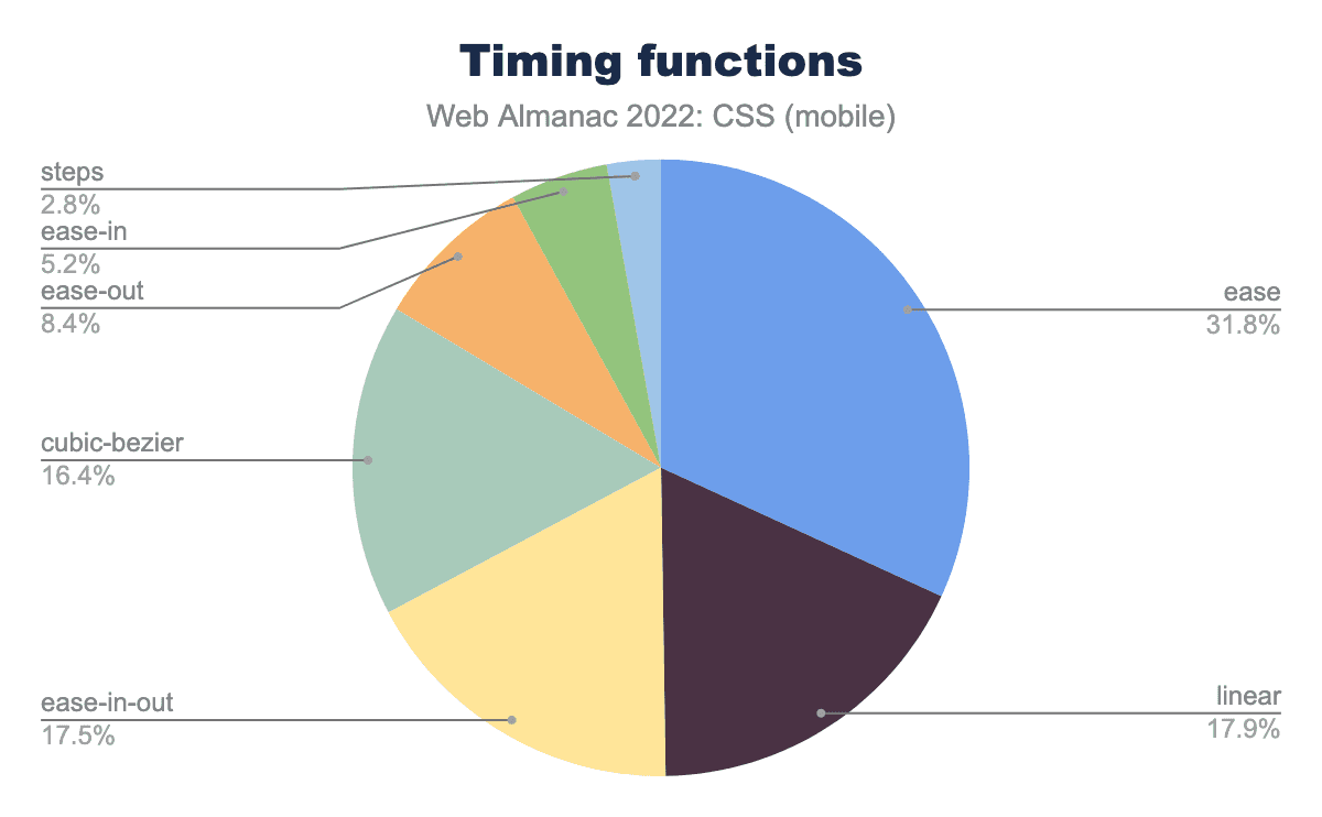 easeが31.8%、linear 17.9%、ease-in-out 17.5%、cubic-bezier 16.4%、ease-outは8.4%、ease-in 5.2%、stepsが2.8%の順で使用されました。2021年と比較すると、遷移時に使用されるタイミング機能の分布はほとんど変化していない。当時と同様に、明確なトップはeaseです。