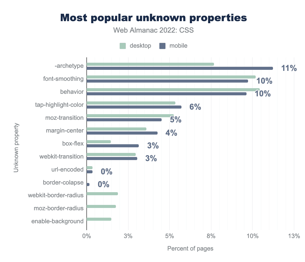 -archetypeで11%、次いでfont-smoothingとbehaviorで10%、tap-highlight-color 6%、moz-transition 5%、min-center 4%、box-flex 3%、webkit-transitionでは3%、残りはすべて1%未満のページで見つかり、url-encoded、border-collapse、webkit-border-radius、moz-border-radiusおよびenable-backgroundとなっています。謎のプロパティのトップは -archetype で、存在しないプロパティを持つスタイルシートのケースの11%で出現するようになりました。このプロパティは、昨年の4%から11%に急上昇し、トップの座を獲得しています。2番目のプロパティは font-smoothing で、昨年より4%ポイント低下している。これは実際には存在しない -webkit-font-smoothing の接頭辞なしバージョンであるように見えます。不正な webkit-transition(本来は -webkit-transition であるべき)の使用は、14%から3% に減少しました。このことから、おそらくフレームワークなどのサードパーティを介して大量のスタイルシートに入り込んでいたものと思われますが、その後アップデートで問題が修正されました。