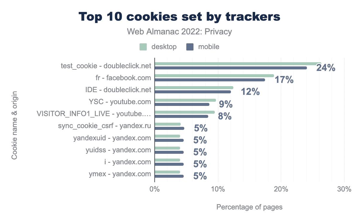 test_cookieという名前のクッキーは、それぞれデスクトップサイトの26%とモバイルサイトの24%で見られます。facebook.comによって設定されたfrは19%と17%、doubleclick.netによって設定されたIDEは12%と12%、youtube.comによって設定されたYSCは10%と9%、VISITOR_INFO1_LIVEは10%と8%、yandex.ruによって設定されたsync_cookie_csrfは4%と5%、yandex.comによって設定されたyandexuidは4%と5%、yuidssは4%と5%、iは4%と5%、そして最後にyandex.comによって設定されたymexは4%と5%です。最も一般的なサードパーティクッキーを見ると、再びいくつかの追跡ドメインが現れます。doubleclick.netからのtest_cookieが先導しており、これは機能目的で使用されるクッキーで、寿命は15分です。このクッキーに続いて、facebook.comによって設定されたfrクッキーがあります。これは「広告の配信、測定、および関連性の向上のために使用されるクッキーで、寿命は90日です」とその定義によるとされています。最も普及している10個のサードパーティクッキーの残りはYouTubeとYandexによって設定されています。