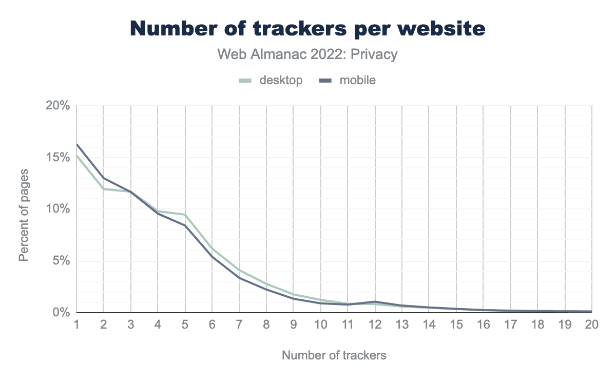 ウェブサイトは複数のサードパーティサービスを利用したいかもしれませんので、そのウェブサイトには複数のトラッカーが含まれることがあります(詳細については、ウェブ上に含まれるサードパーティに関するサードパーティ章をぜひご覧ください!)。私たちは、デスクトップサイトの約15%とモバイルサイトの16%が「ちょうど」1つのトラッカーを含んでいることを発見しました。残念ながら、これはウェブサイトが複数のトラッカーを含むことがより一般的であることを意味します。私たちは126個の異なるトラッカーを含むウェブサイトさえ見つけました!