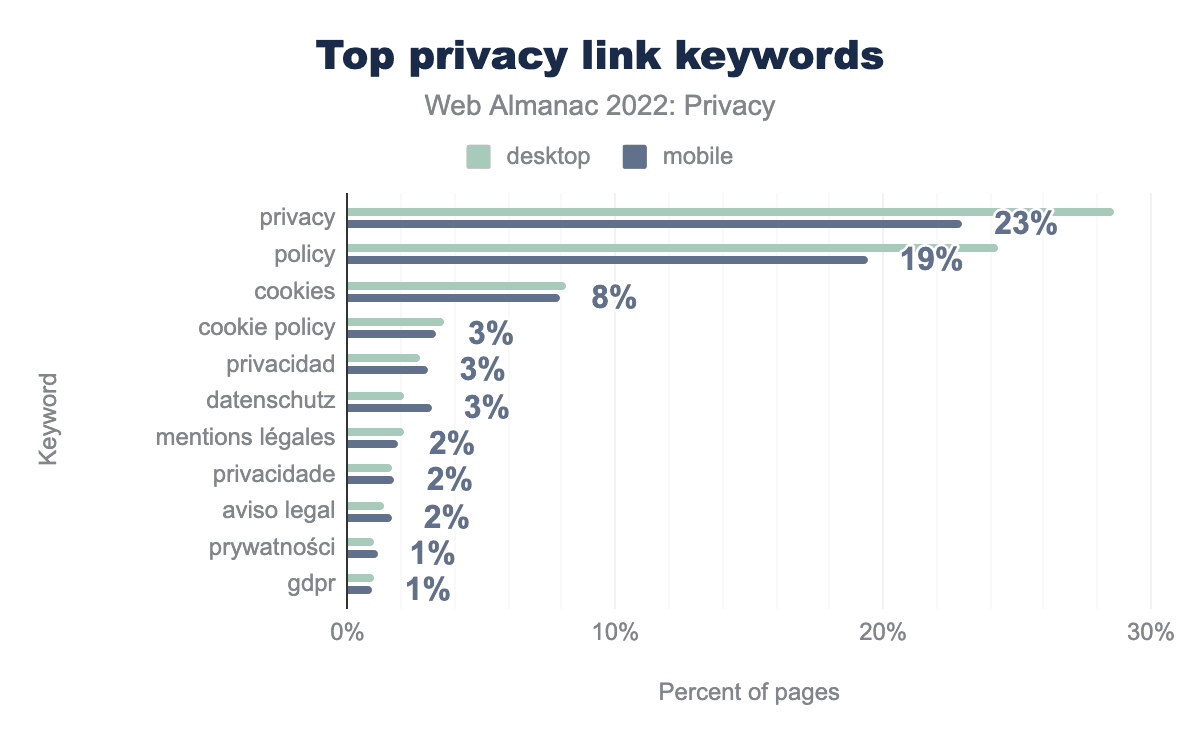 データ処理に関する通知は、同意バナーを介して行われるだけではありません。これらは通常、そのようなバナーと比較して別のページでより詳細に説明されます。このようなページでは、統合されたサードパーティ、どのデータがどの目的で処理されるかなどの情報を見つけることができます。このようなサイトを特定するために、ある研究からのプライバシーに関連するシグネチャを使用しました。この方法を使用して、デスクトップウェブサイトの45%(モバイルでは41%)がホームページにプライバシー関連ページへのリンクを含んでいることが判明しました。以下の図は、トッププライバシーリンクキーワードの分布を示しています。