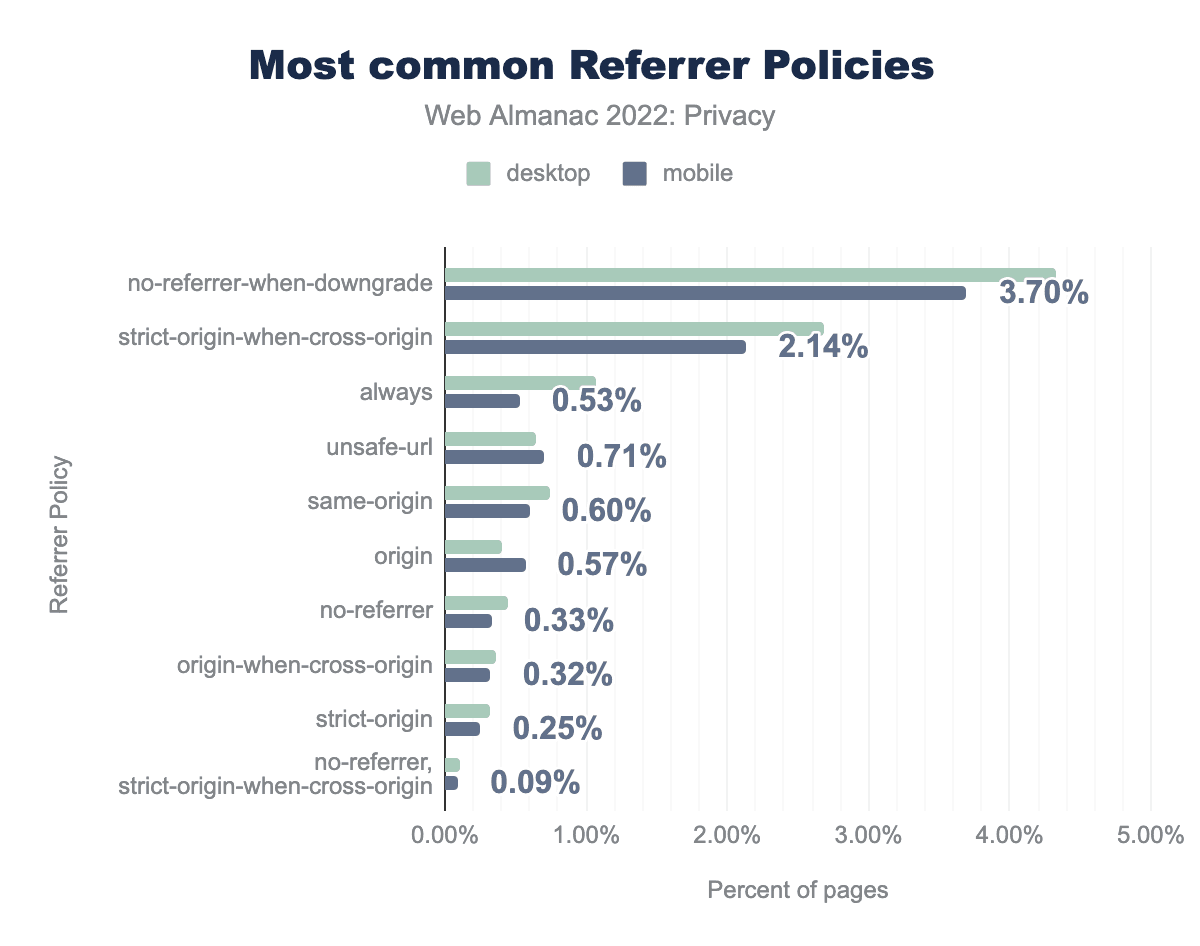 no-referrer-when-downgradeはデスクトップで4.33%、モバイルで3.70%のサイトで見つかりました。strict-origin-when-cross-originはデスクトップで2.68%、モバイルで2.14%、alwaysは1.07%と0.53%、unsafe-urlは0.64%と0.71%、same-originは0.74%と0.60%、originは0.41%と0.57%、no-referrerは0.44%と0.33%、origin-when-cross-originは0.37%と0.32%、strict-originは0.32%と0.25%、そして最後にno-referrer, strict-origin-when-cross-originはデスクトップで0.11%、モバイルで0.09%のサイトで見つかりました。リファラーポリシーの使用状況を見ると、Refererヘッダーをダウングレードリクエストに含めないことが最も一般的です。つまり、HTTPSが有効なページで開始されたHTTPリクエストには含まれません。残念ながら、これはほとんどのシナリオでHTTPSリクエストにおいてユーザーが訪れたページが漏れることを意味します。しかし、デスクトップサイトの2.7%とモバイルサイトの2.1%がstrict-origin-when-cross-originポリシーを用いて、ユーザーが訪れた具体的なウェブページを隠そうとしています。これは現在、ポリシーが指定されていない場合のほとんどのブラウザのデフォルトです。