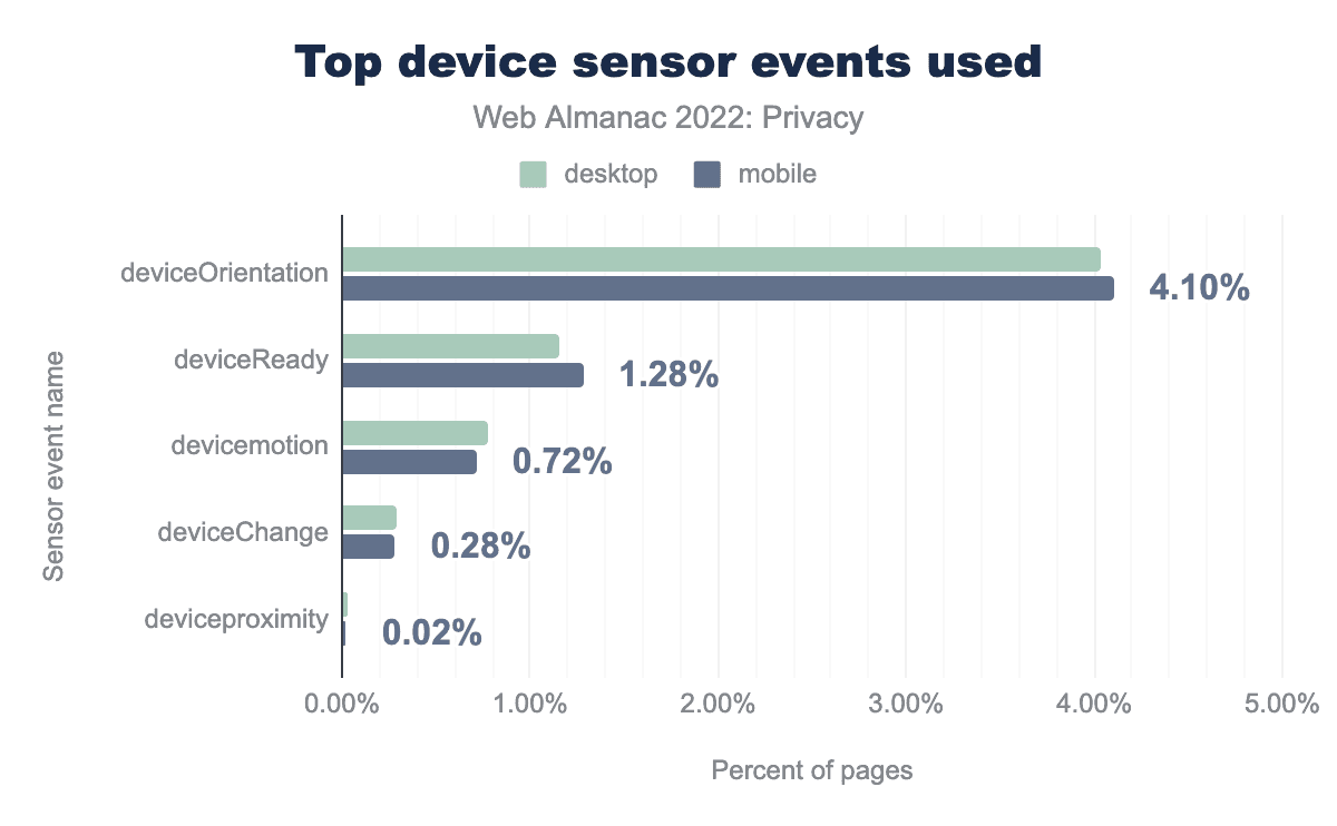 deviceOrientationイベントはデスクトップで4.04%、モバイルで4.10%のサイトで使用されており、deviceReadyは1.16%と1.28%、devicemotionは0.78%と0.72%、deviceChangeは0.29%と0.28%、最後にdeviceproximityイベントはデスクトップで0.03%、モバイルで0.02%のサイトで見られました。ウェブサイトが最も注目しているセンサーイベントはdeviceOrientationイベントであり、デバイスがポートレートモードからランドスケープモードに変わる、またはその逆の場合に発生します。デスクトップウェブサイトの4.0%、モバイルウェブサイトの4.1%で使用されています。使用率が(比較的)高いのは、デバイスの向きが変わるとウェブサイトがレイアウトの要素を更新したいと考えるかもしれないからです。